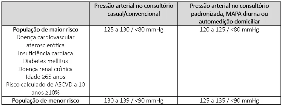 Metas de pressão arterial podem ser mais rigorosas em pacientes de alto risco (ex.: doença arterial coronariana, AVC prévio, risco cardiovascular ≥15%) devido a um maior suporte de evidências. Em pacientes frágeis, com demência ou expectativa de vida limitada, as metas devem ser individualizadas e decididas de forma compartilhada com o paciente e familiares.